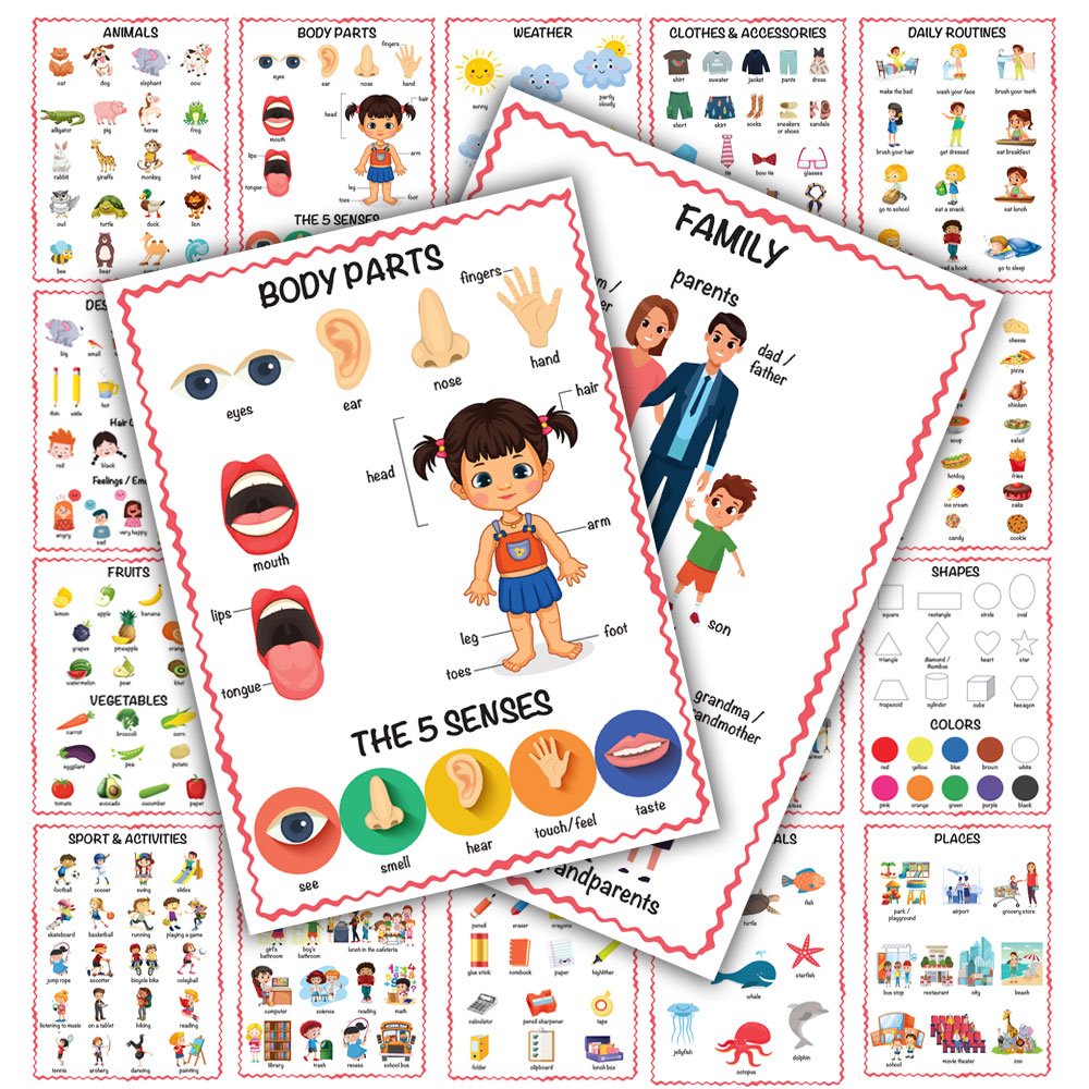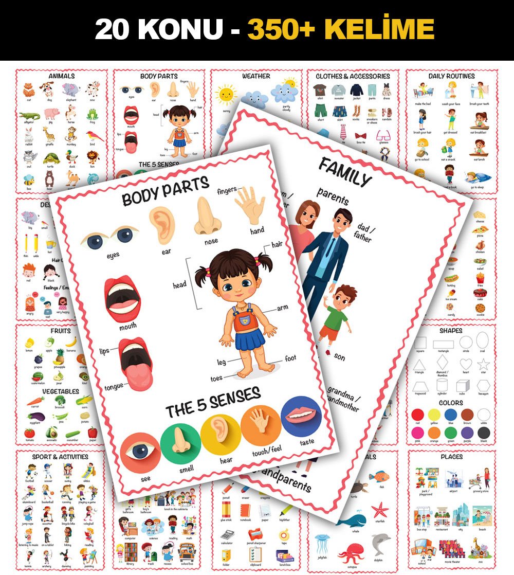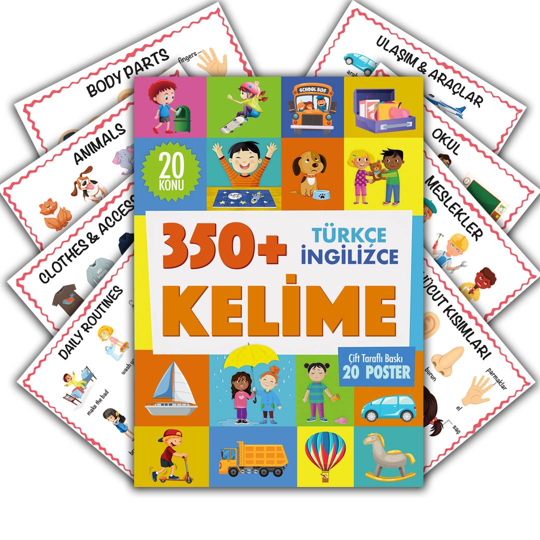 Tam 20 konudan oluşan çocuklarınızın 350 den fazla kelime öğrenmesini sağlayan muhteşem bir poster seti. 33x24cm boyutunda arkalı önlü hem Türkçe hem İngilizce 20 eğitici öğretici poster.
