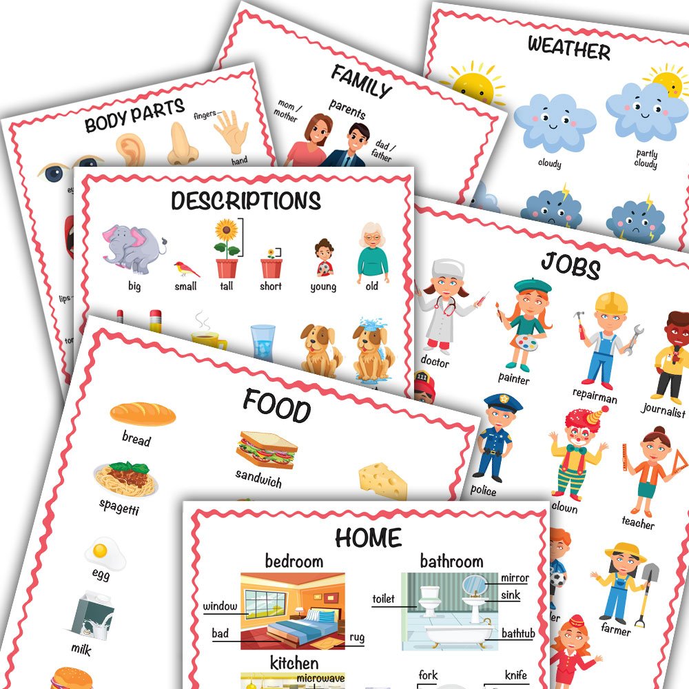 Okul, Okul Malzemeleri, Vücut Parçaları, Açıklamalar, Yiyecek, Meyve ve Sebzeler, Spor ve Aktiviteler, Oyuncaklar, Yerler, Aile, Ulaşım, Günlük Rutinler, Ev, Okyanus Hayvanları, Çiftlik / Hayvanat Bahçesi Hayvanları, Böcekler, Meslekler, Şekiller ve Renkler, Giysiler ve Aksesuarlar, Hava durumu?.